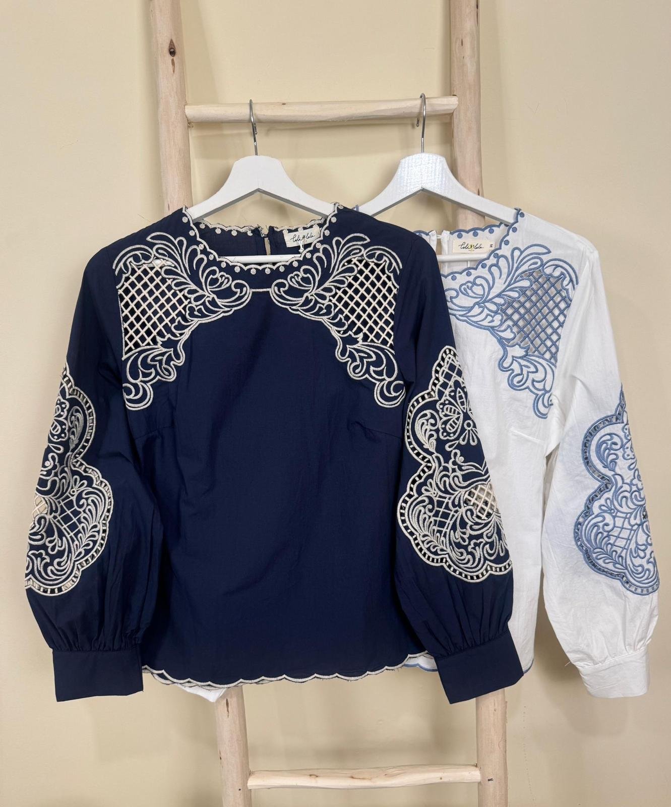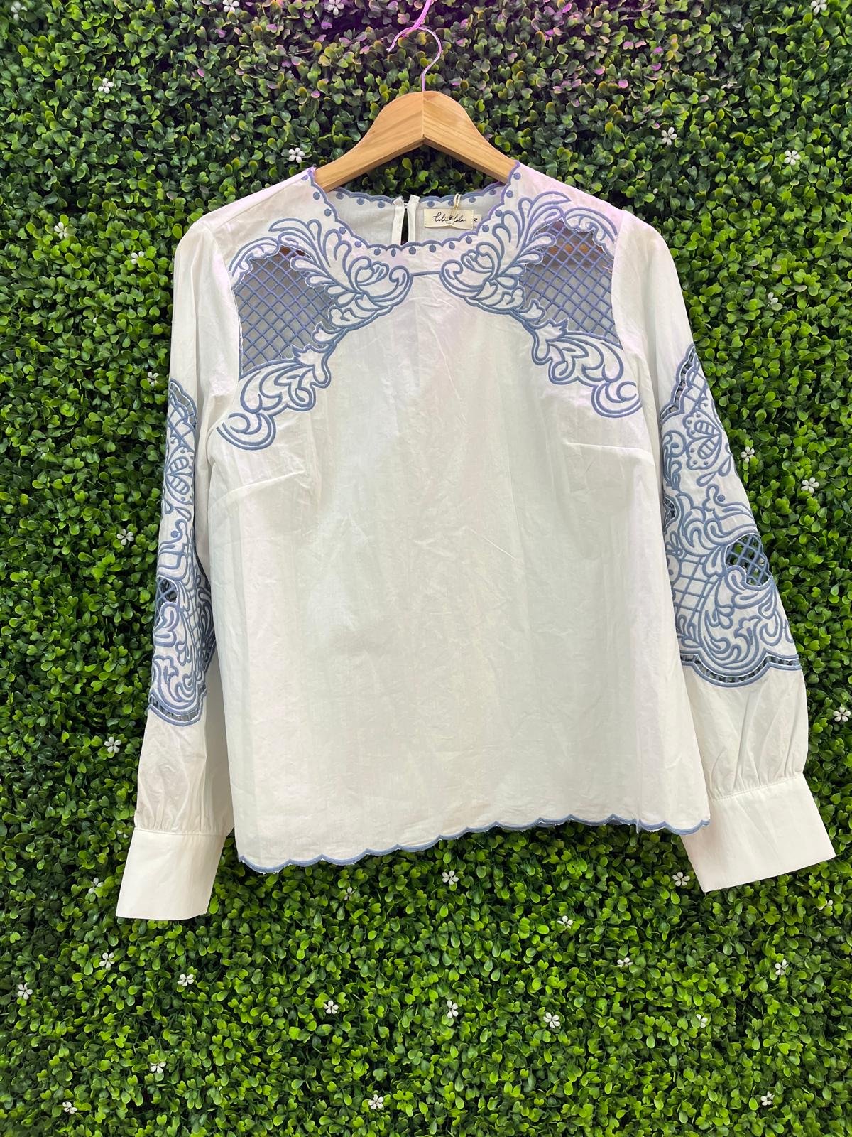 Blusa blanca de estilo artesanal con delicado bordado azul. Fresca, ligera y perfecta para looks casuales y elegantes.